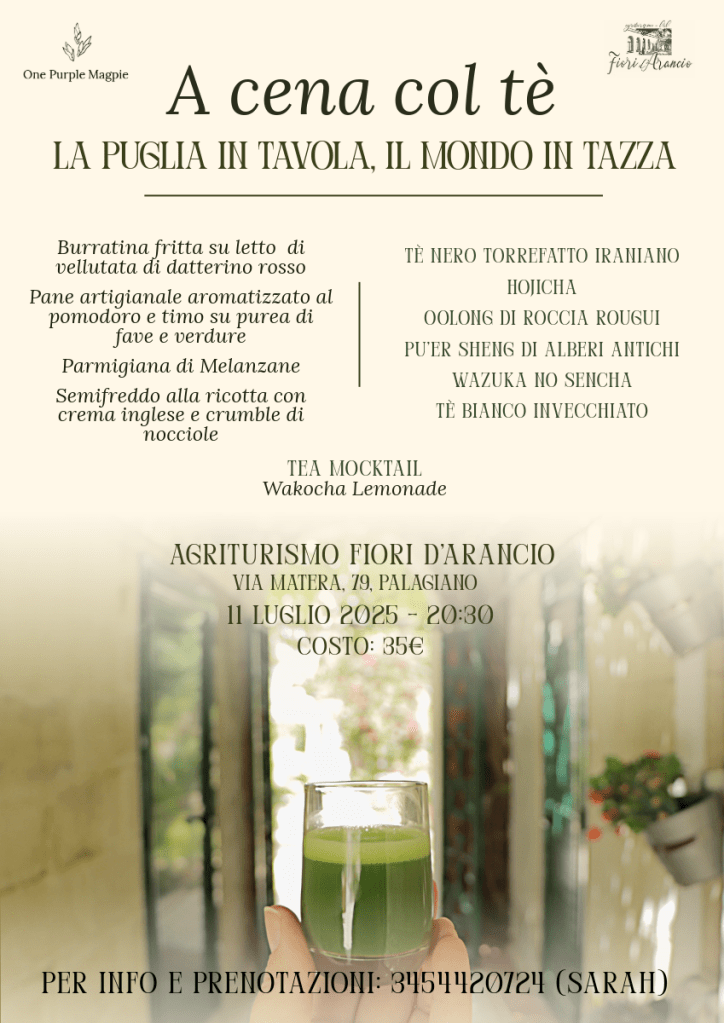 Sei tè dal mondo, raccontati dalla tea specialist Sarah, incontrano la cucina tradizionale pugliese di Tommaso in una cena unica e speciale.